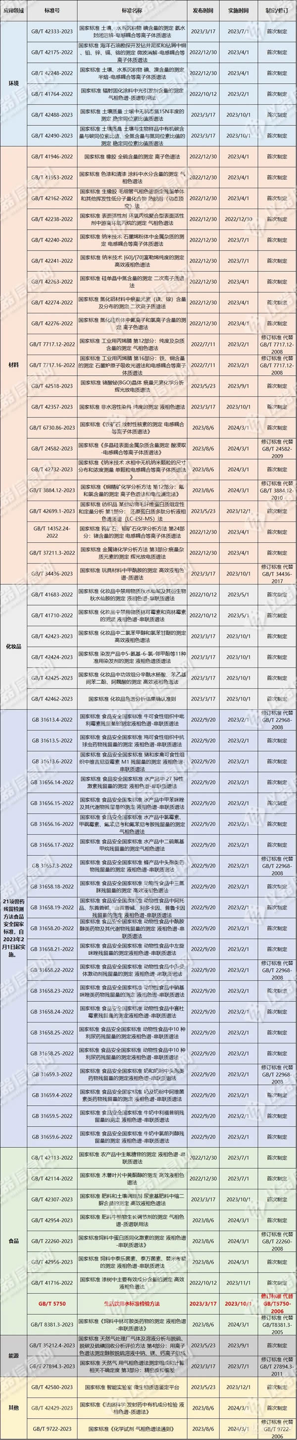 據(jù)統(tǒng)計,2023年實施的色質(zhì)譜相關(guān)的國家標(biāo)準(zhǔn)共有58項,其中54項為檢測標(biāo)準(zhǔn),4項為儀器性能和方法通則標(biāo)準(zhǔn)。58項國家標(biāo)準(zhǔn)中涉及食品、材料、環(huán)境、化妝品、醫(yī)療等多個領(lǐng)域。其中檢測方法以ICP-MS、LC-MS和GC-MS為主,有四項涉及到離子色譜方法。