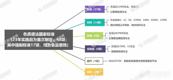 據(jù)統(tǒng)計,2023年實施的色質(zhì)譜相關(guān)的國家標(biāo)準(zhǔn)共有58項,其中54項為檢測標(biāo)準(zhǔn),4項為儀器性能和方法通則標(biāo)準(zhǔn)。在2023年實施的色質(zhì)譜法國家標(biāo)準(zhǔn)中,有48項為首次制定,其中強制標(biāo)準(zhǔn)17項,17項均為食品獸殘檢測。值得關(guān)注的是,21項獸藥殘留檢測方法食品安全國家標(biāo)準(zhǔn),自2023年2月1日起實施,檢測方法以LC-MS為主。